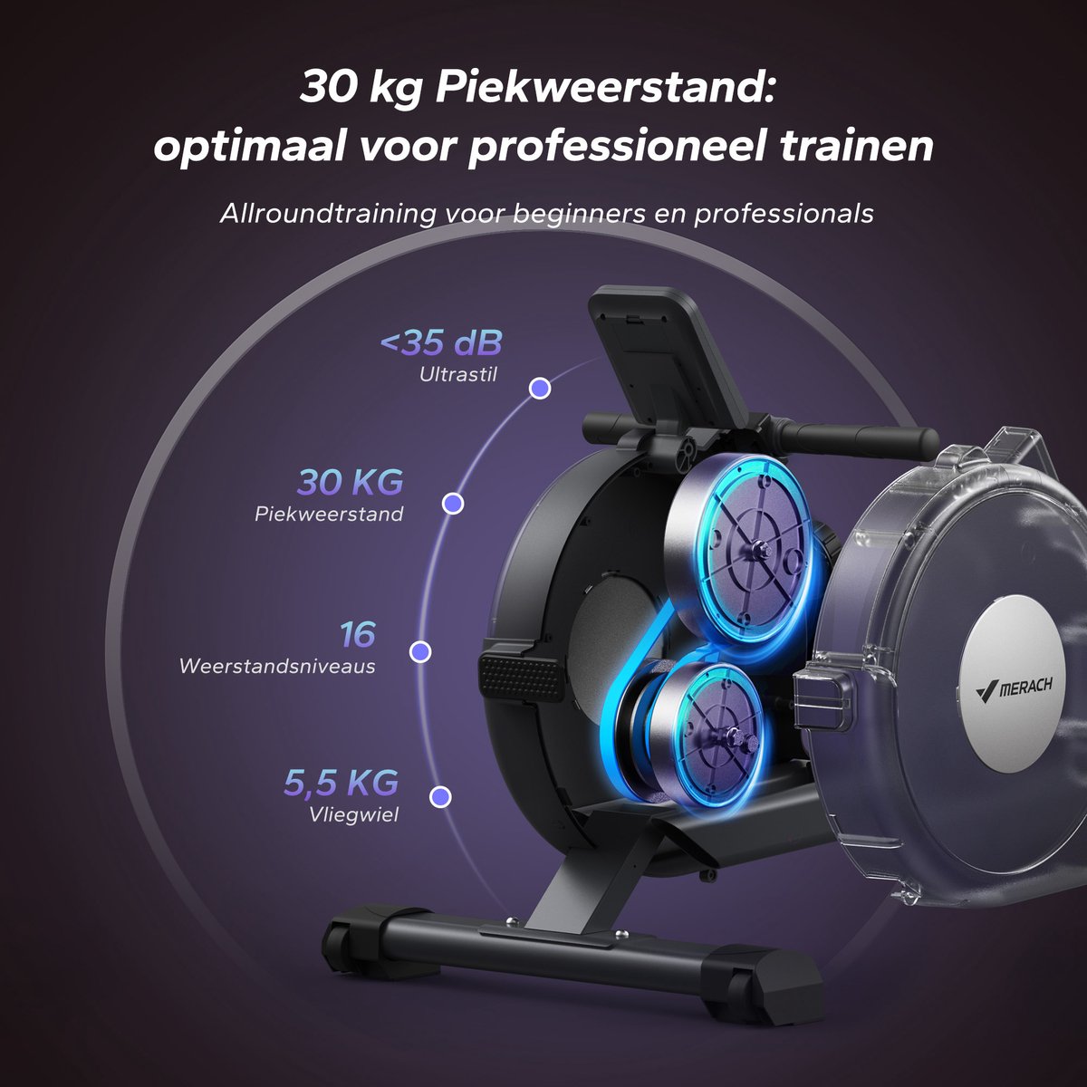Ja, de MERACH gebruikt een stil magnetisch vliegwielsysteem dat weinig geluid maakt en dus geschikt is voor thuisgebruik, ook in gedeelde woonruimtes. De dubbele rails zorgen daarnaast voor een gelijkmatige, rustige beweging zonder veel trilling.
